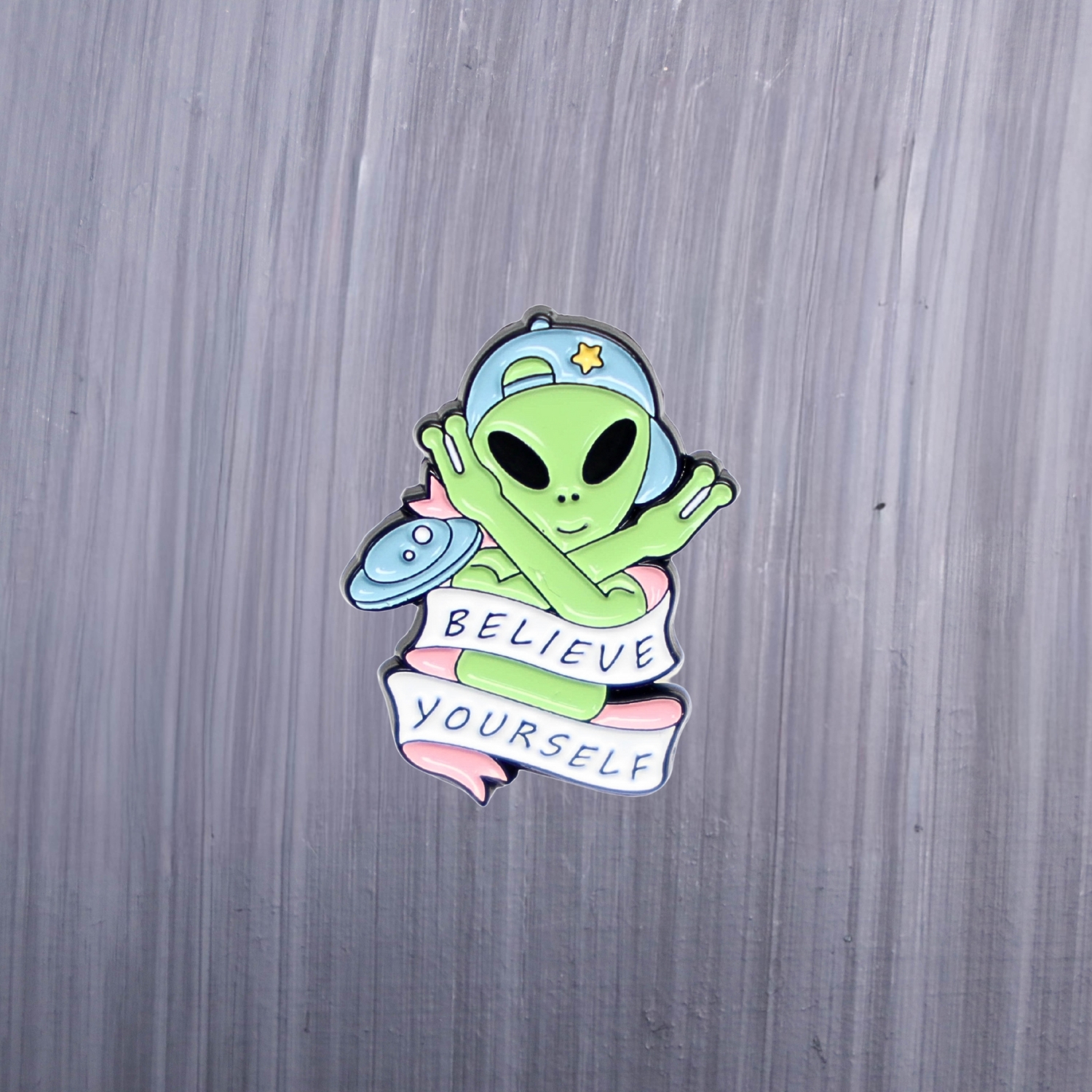 Alien believe yourself enamel pin green with blue hat. These enamel pins are made with metal. These enamel pins are colorful, with a black backing.