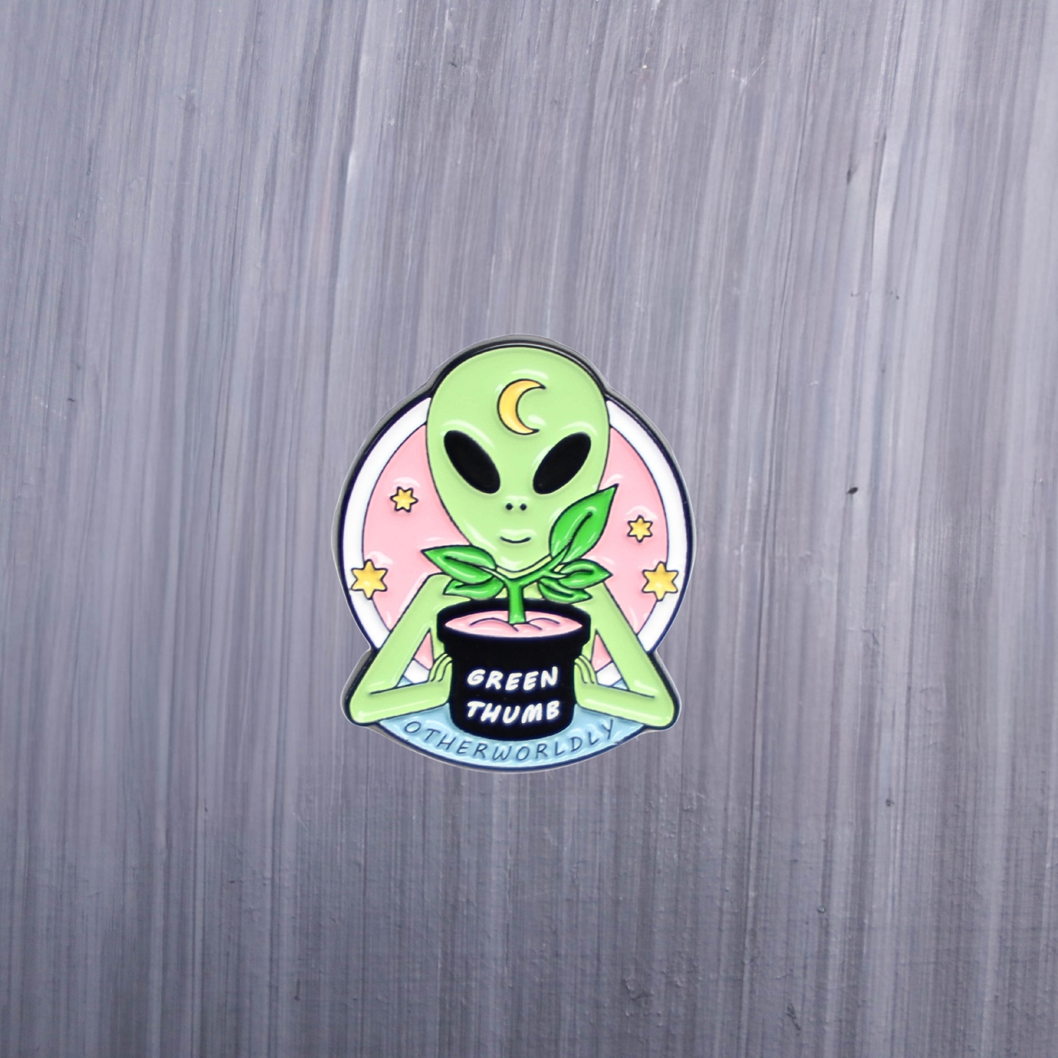 Alien Green Thumb Enamel Pin with plant. These enamel pins are made with metal. These enamel pins are colorful, with a black backing.