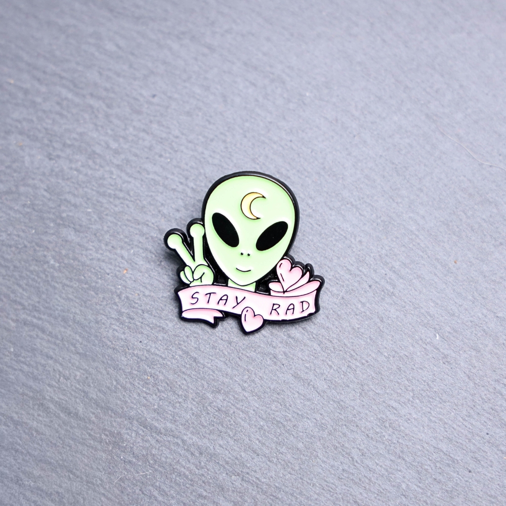 Alien Stay Rad Enamel Pin green alien with pink and moon on his head. These enamel pins are made with metal. These enamel pins are colorful, with a black backing.