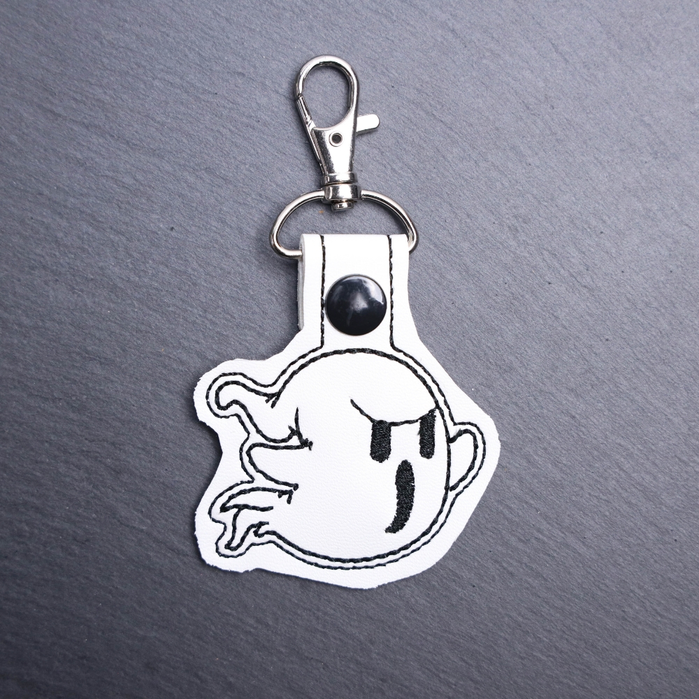Angry Ghost Snap Bag Tag. This bag tag is made with faux vinyl and embroidered. Comes with lobster clasp topper that easily hooks to a bag, zippers, keychains, and lanyards for fun display and swivels. Backside is the color of the vinyl with a border stitch. Snap color can vary. Edging on this product isn’t perfect as it is hand cut then fabric glue sealed.