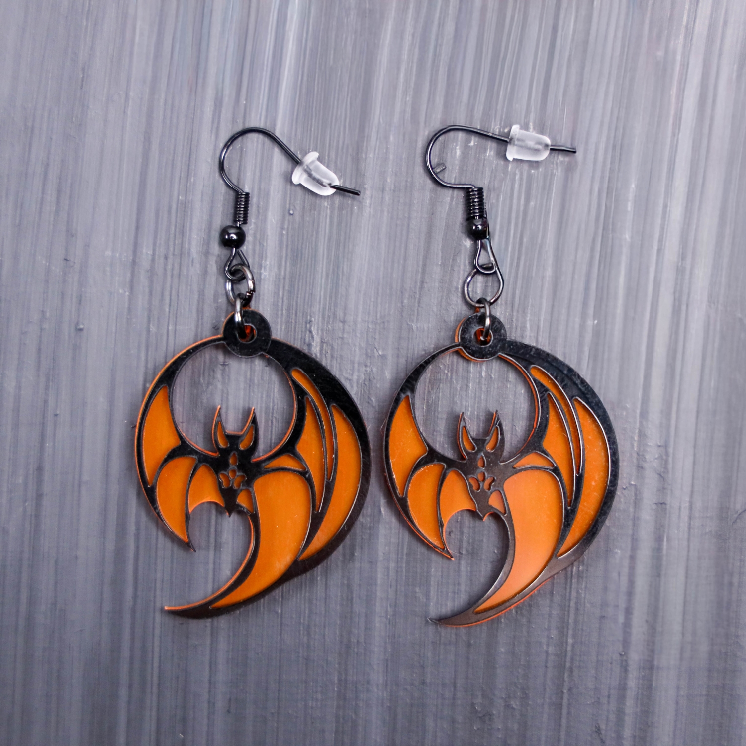 Bat Wicked Earrings. These earrings are made with acrylic. Comes with black hooks that is nickel free.