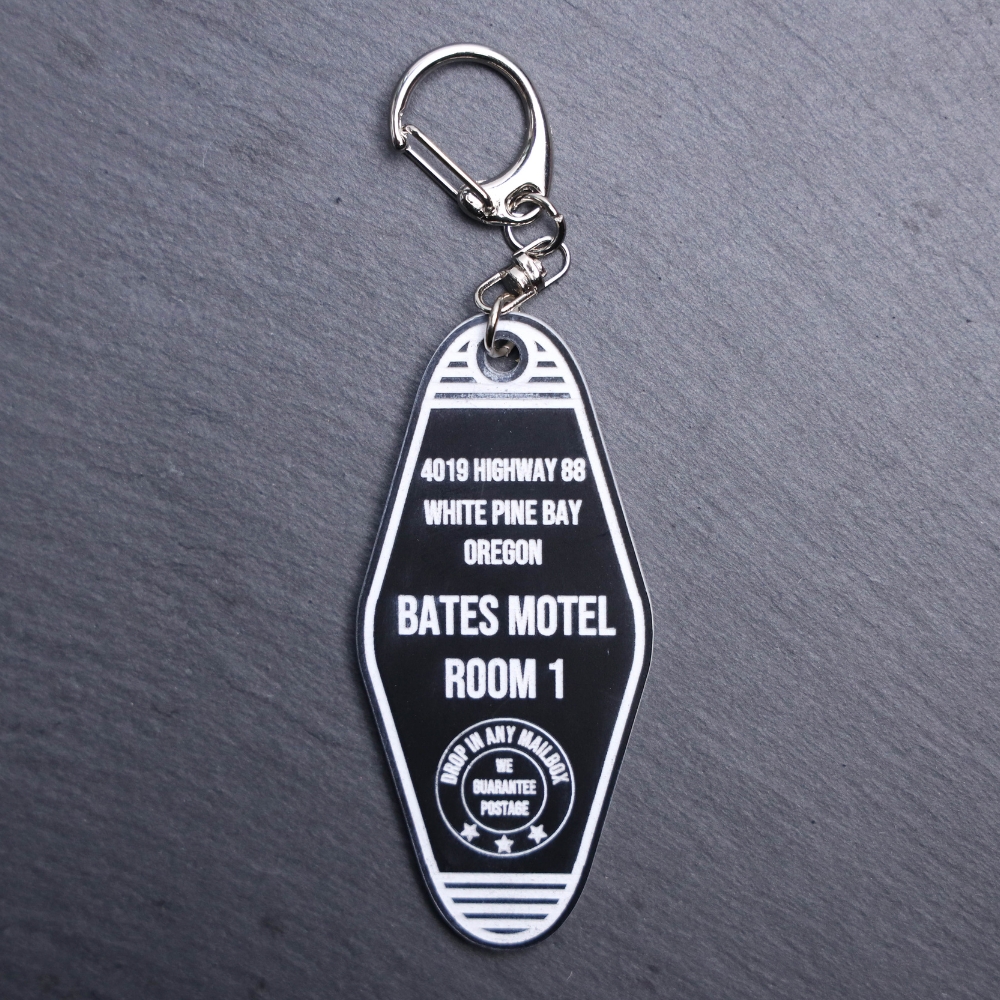 Bates Motel TV Bag Tag. This bag tag is made with engraved acrylic. Comes with lobster clasp topper that easily hooks to a bag, zippers, keychains, and lanyards for fun display and swivels. White backside.