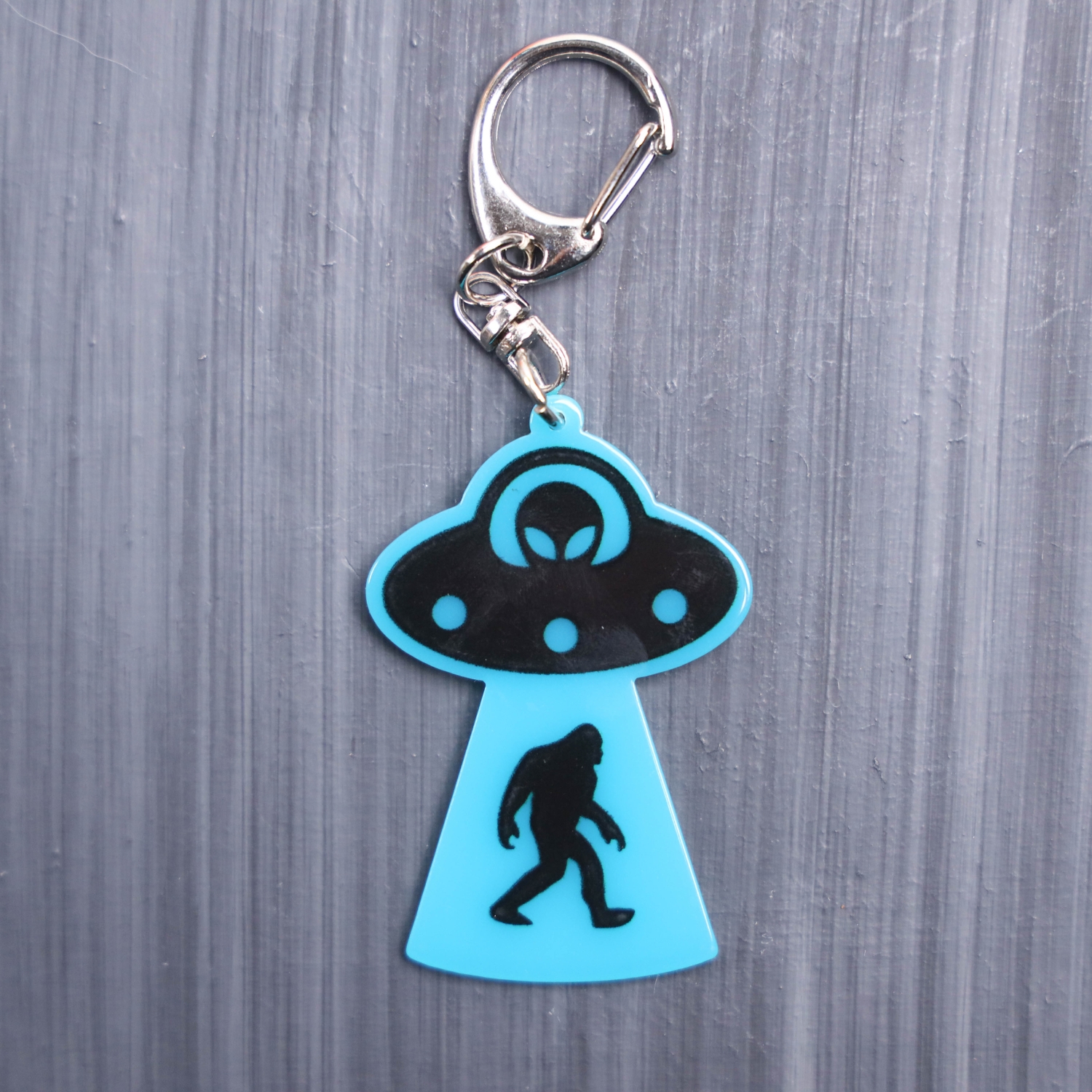 Bigfoot Abduction Neon Blue Bag Tag with black ship and black backing. Acrylic designed charm with a swivel lobster snap hook in high quality metal alloy.