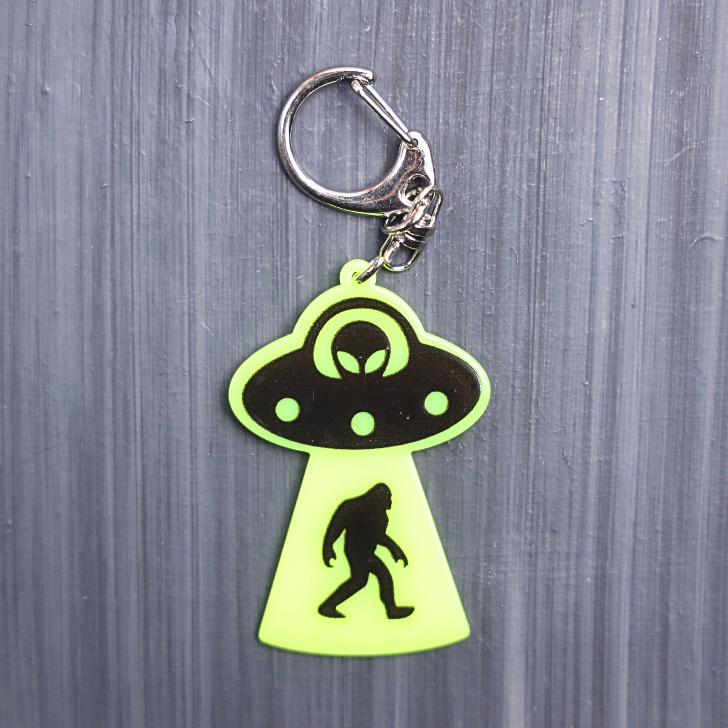 Bigfoot Abduction Neon Yellow Bag Tag with black ship and black backing. Acrylic designed charm with a swivel lobster snap hook in high quality metal alloy.