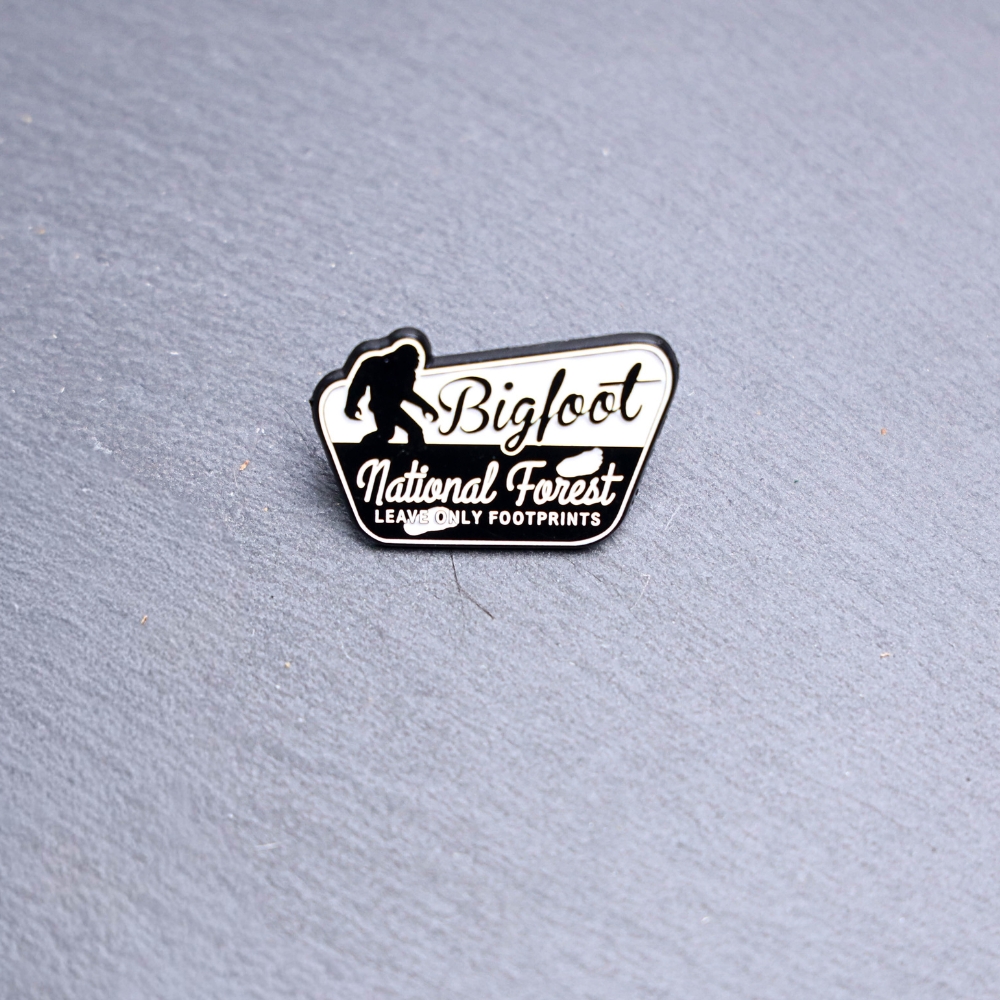 Bigfoot National Forest Leave Only Footprints Enamel Pin in black and white. These enamel pins are made with metal. These enamel pins are colorful, with a black backing.