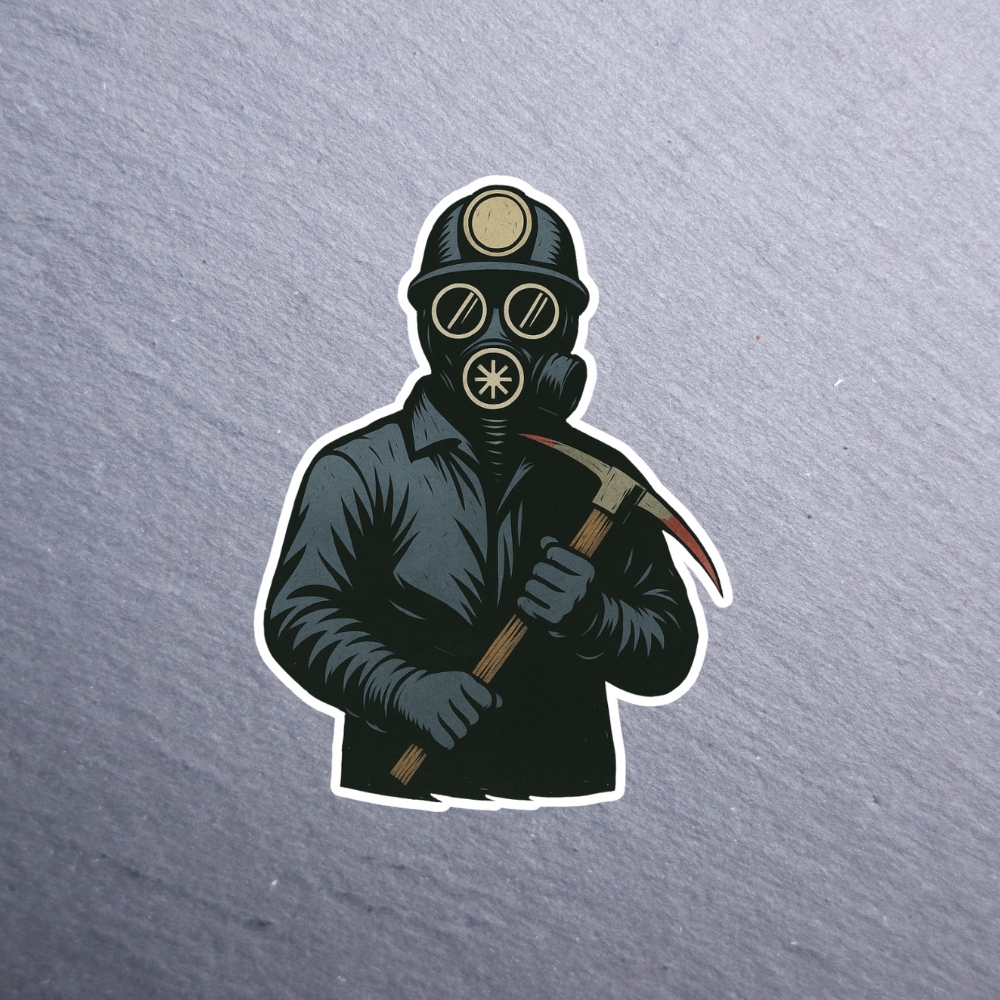 Bloody Miner Sticker. These stickers are made with printable vinyl with a vinyl top coat that is scratch-resistant and water resistant. Put one on your phone case, laptop, iPad, hard cooler; the possibilities are endless.