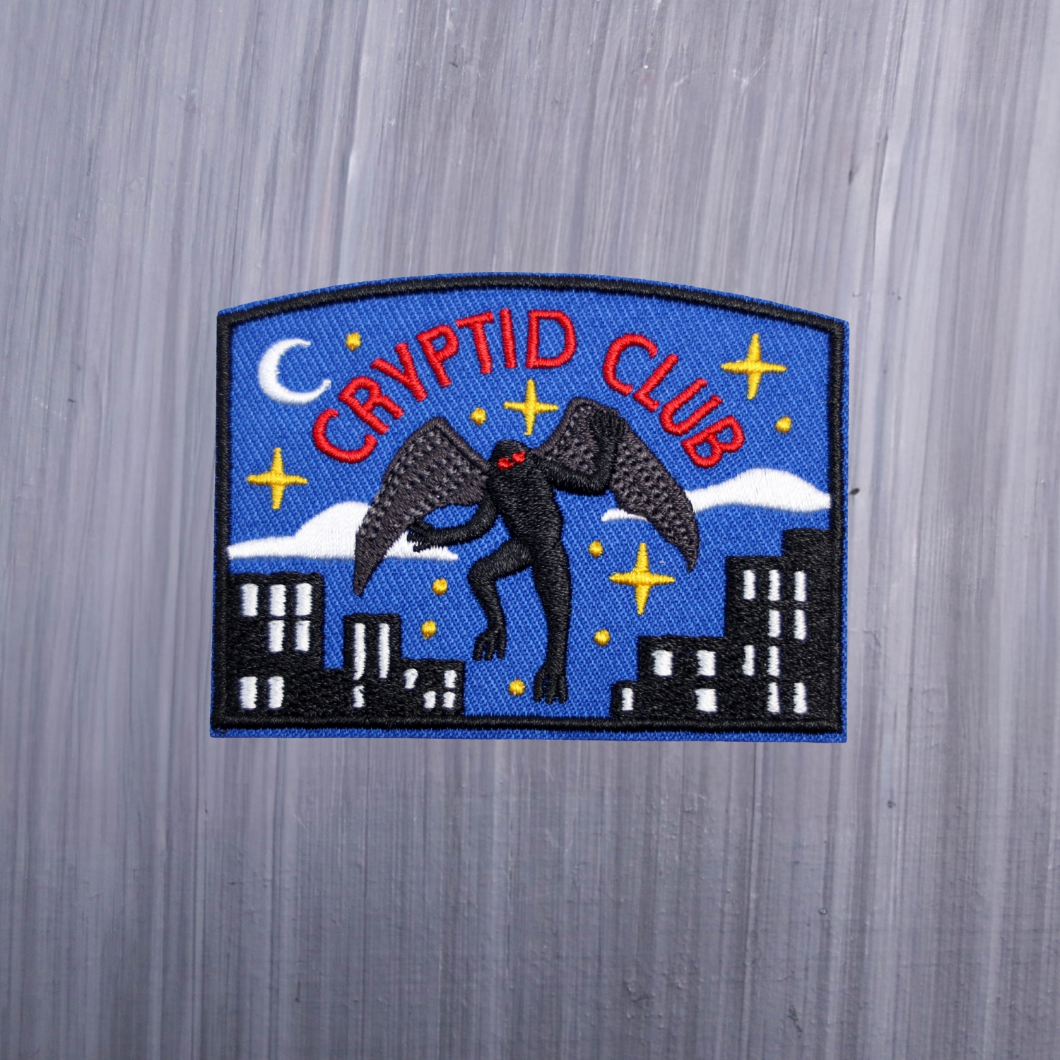 Cryptid Club Mothman Patch with mothman in black and city scene. Beautifully embroidered design with an adhesive for easy application to your favorite bag or article of clothing.
