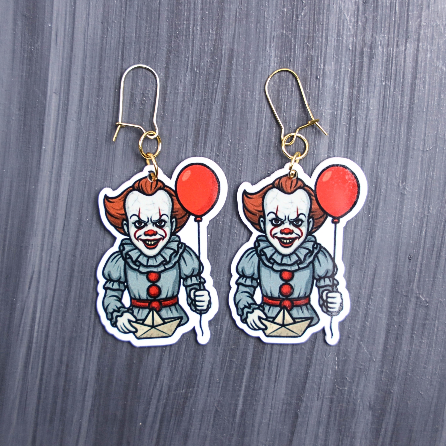 Dancing Clown Earrings. These earrings are made with acrylic and hand heat pressed. Comes with 18k plated gold hooks that is nickel free. Easily put loop through ear and hook back so the earring doesn’t fall out.