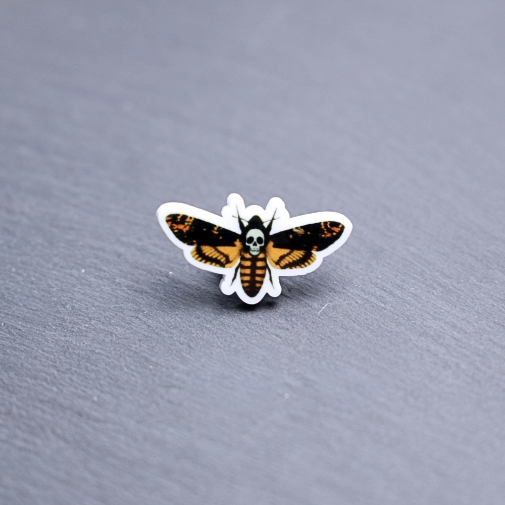 Death Moth Acrylic Pin. These acrylic pins are made with cast acrylic. These pins are colorful, with a black pin back.