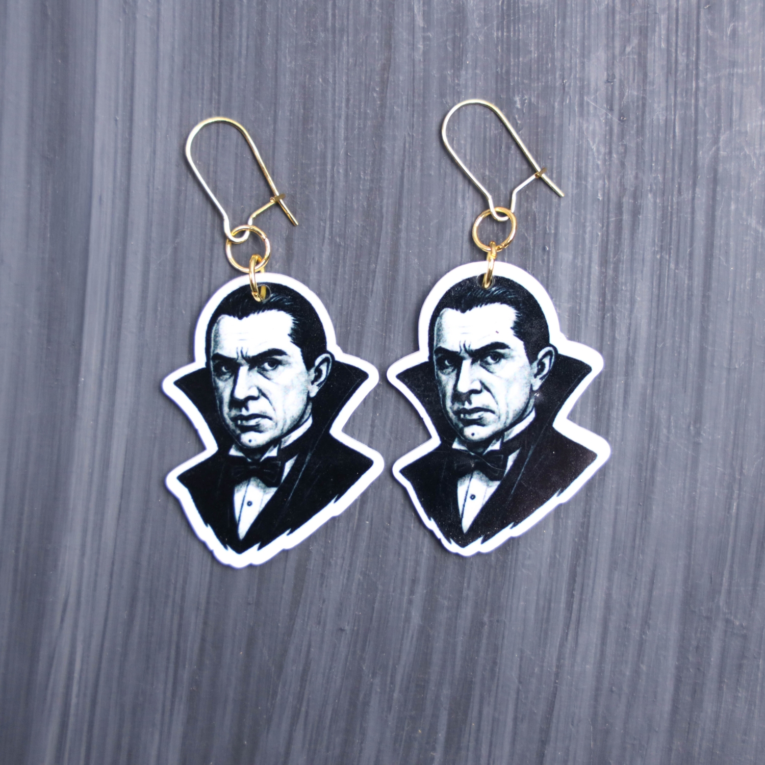 Dracula Earrings. These earrings are made with acrylic and hand heat pressed. Comes with 18k plated gold hooks that is nickel free. Easily put loop through ear and hook back so the earring doesn’t fall out.
