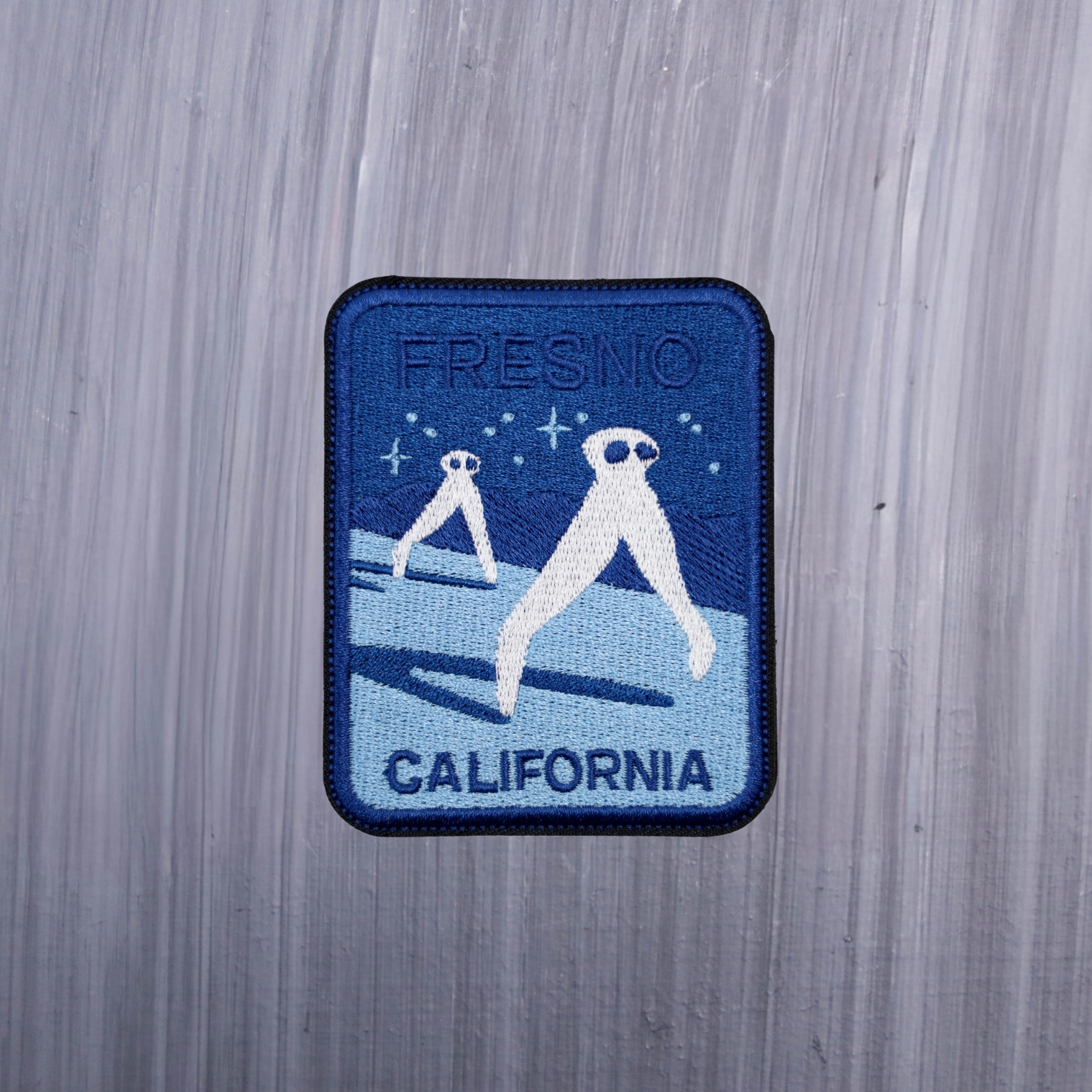 Fresno California Night Crawler Patch with white night crawlers and blue background. Beautifully embroidered design with an Velcro backing with flat back to easily glue with e6000 glue to your favorite bag or article of clothing.