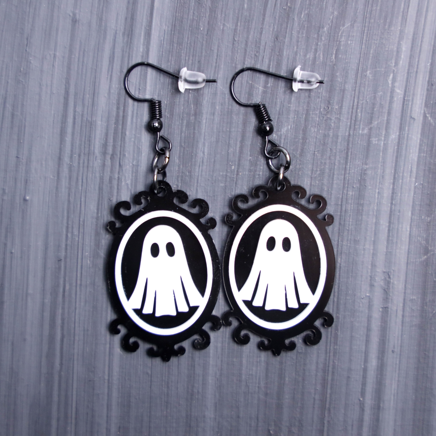 Ghost Frame Earrings. These earrings are made with white  and black acrylic. Comes with black hooks that is nickel free.