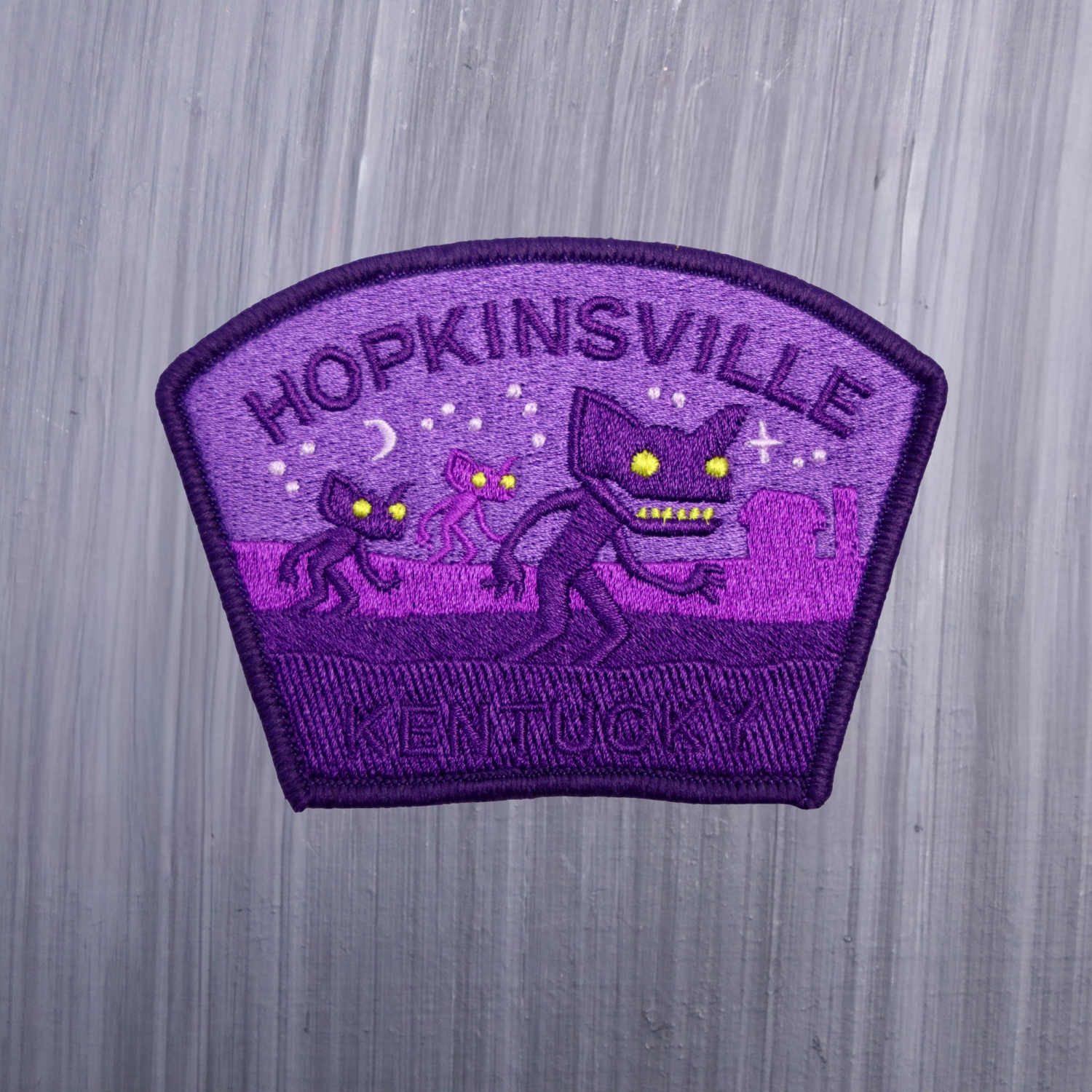 Hopkinsville Goblin Kentucky Patch which is purple with stars and goblins. Beautifully embroidered design with an adhesive for easy application to your favorite bag or article of clothing.
