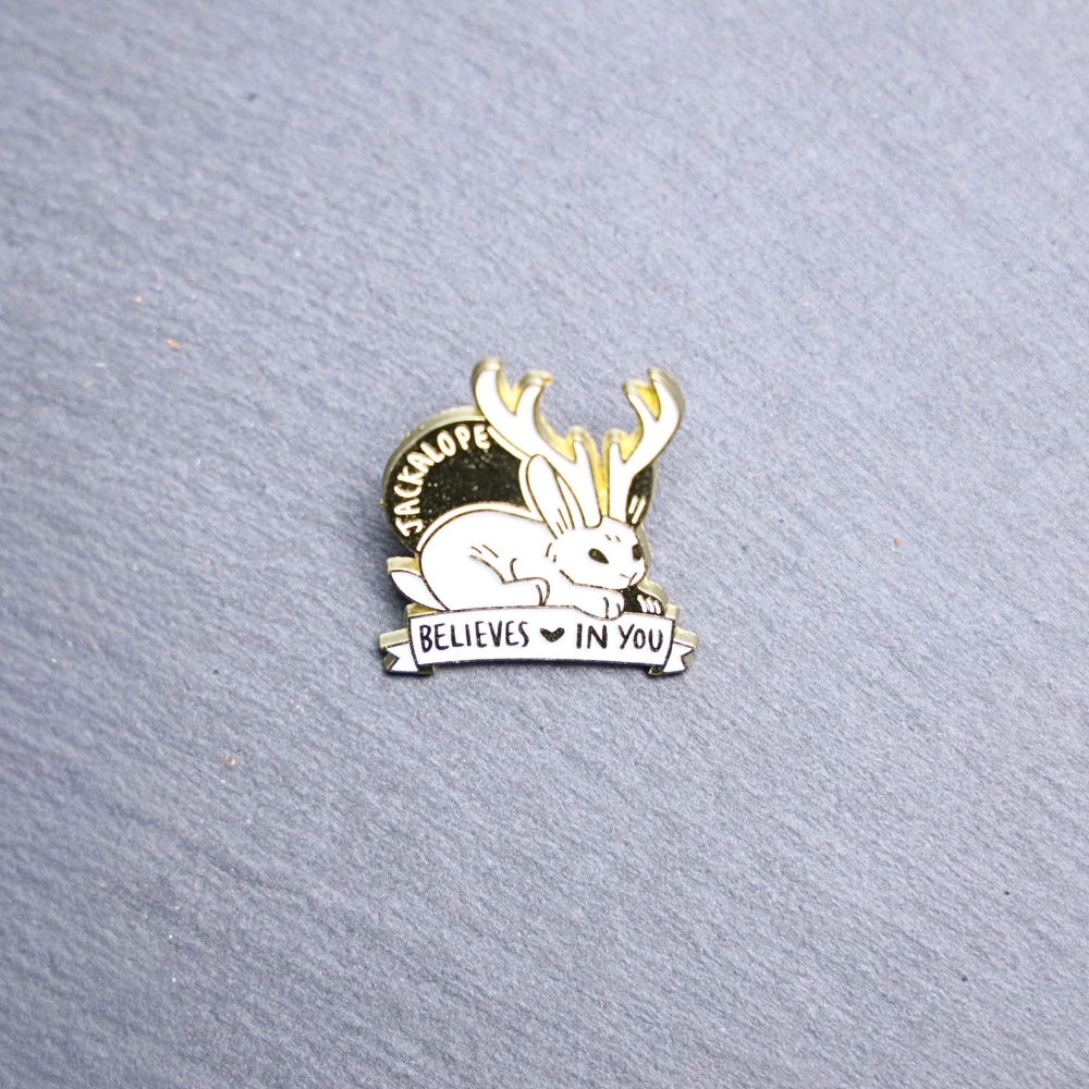 Jackalope Believe In You Enamel Pin in gold and white. These enamel pins are made with metal. These enamel pins are colorful, with a gold colored backing.