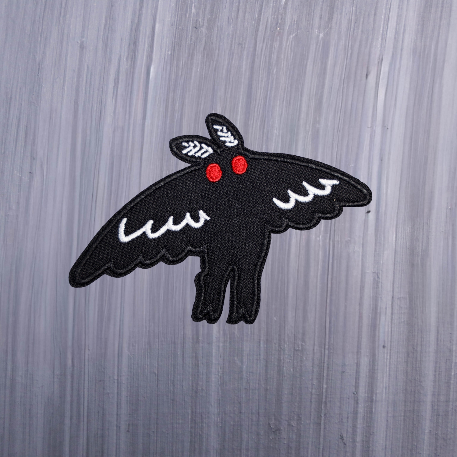 Mothman Flight Patch in black and white with red eyes. Beautifully embroidered design with an adhesive for easy application to your favorite bag or article of clothing.