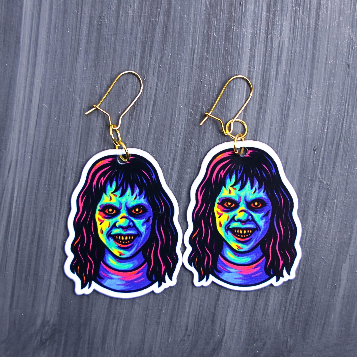 Neon Demon Girl Earrings. These earrings are made with acrylic and hand heat pressed. Comes with 18k plated gold hooks that is nickel free. Easily put loop through ear and hook back so the earring doesn’t fall out.