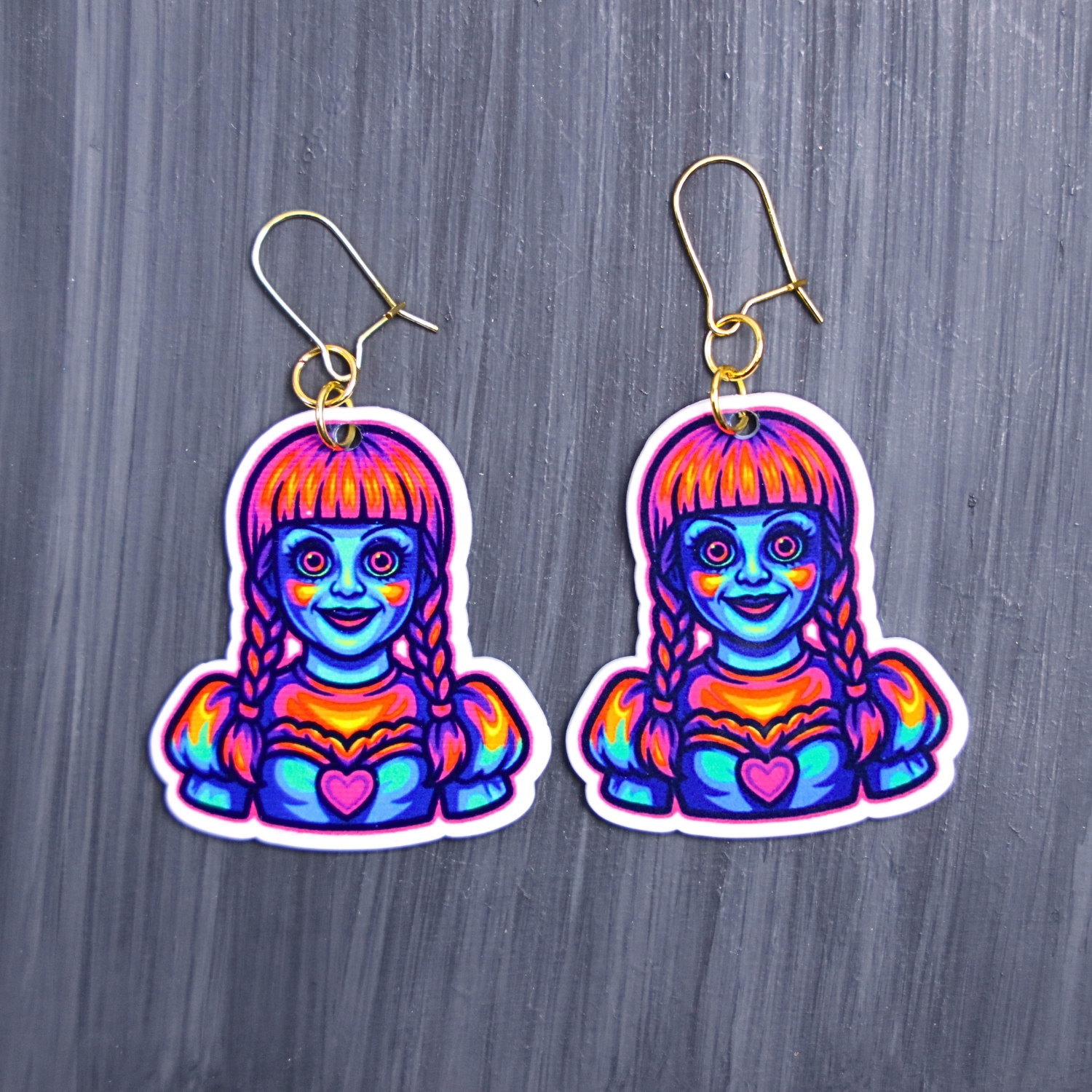 Neon Doll Earrings. These earrings are made with acrylic and hand heat pressed. Comes with 18k plated gold hooks that is nickel free. Easily put loop through ear and hook back so the earring doesn’t fall out.