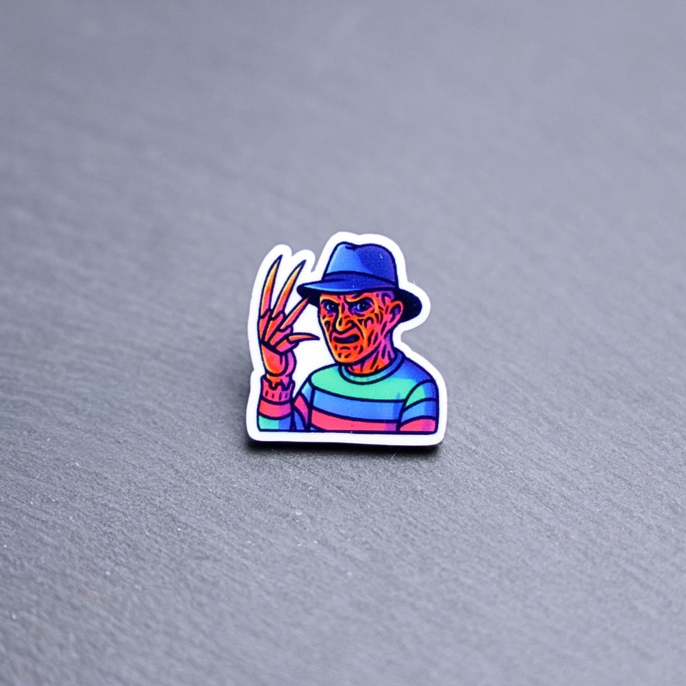Neon Dream Demon Acrylic Pin. These acrylic pins are made with cast acrylic. These pins are colorful, with a black pin back.