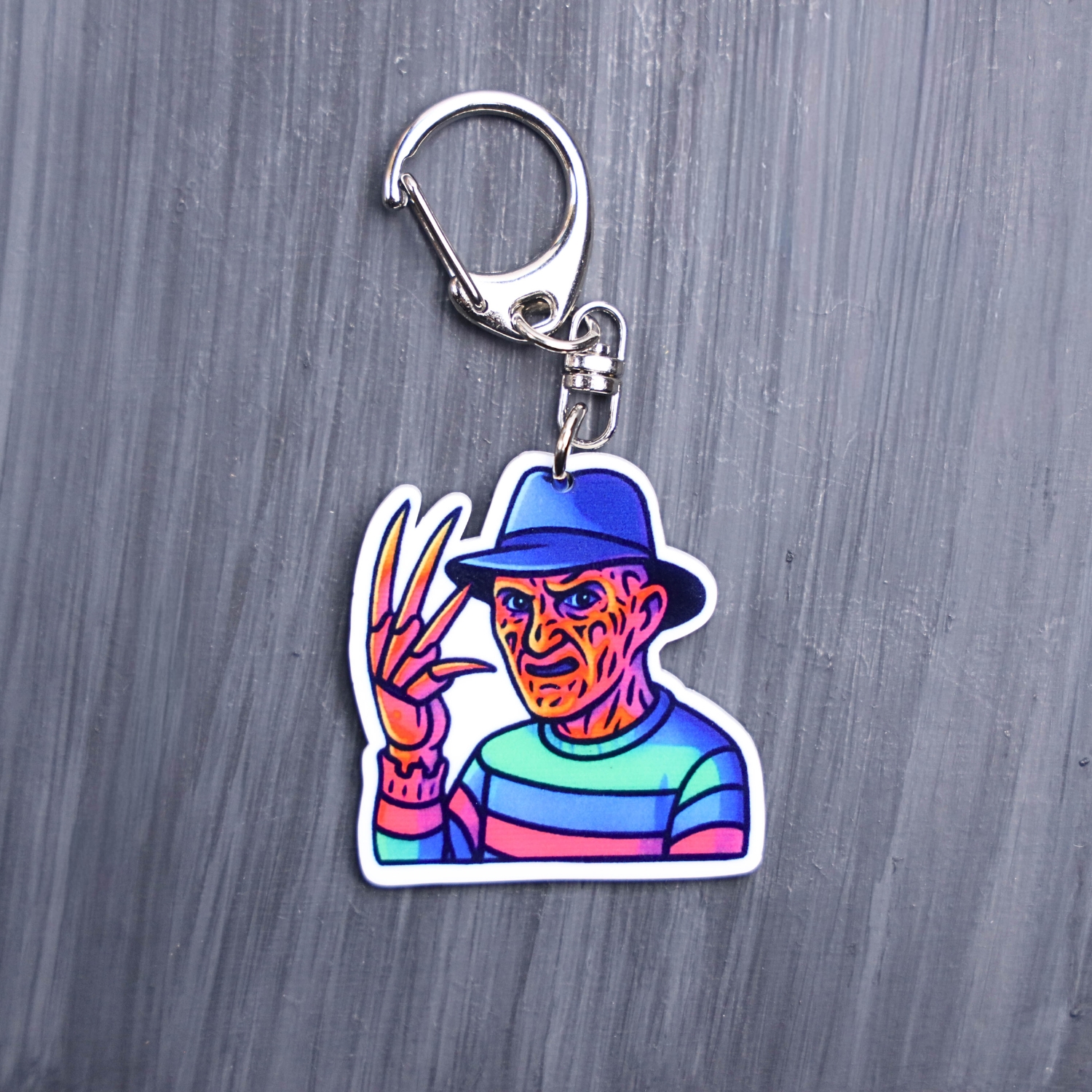Neon Dream Demon Bag Tags. This bag tag is made with acrylic and heat pressed. Comes with lobster clasp topper that easily hooks to a bag, zippers, and lanyards for fun display and swivels. White backside.