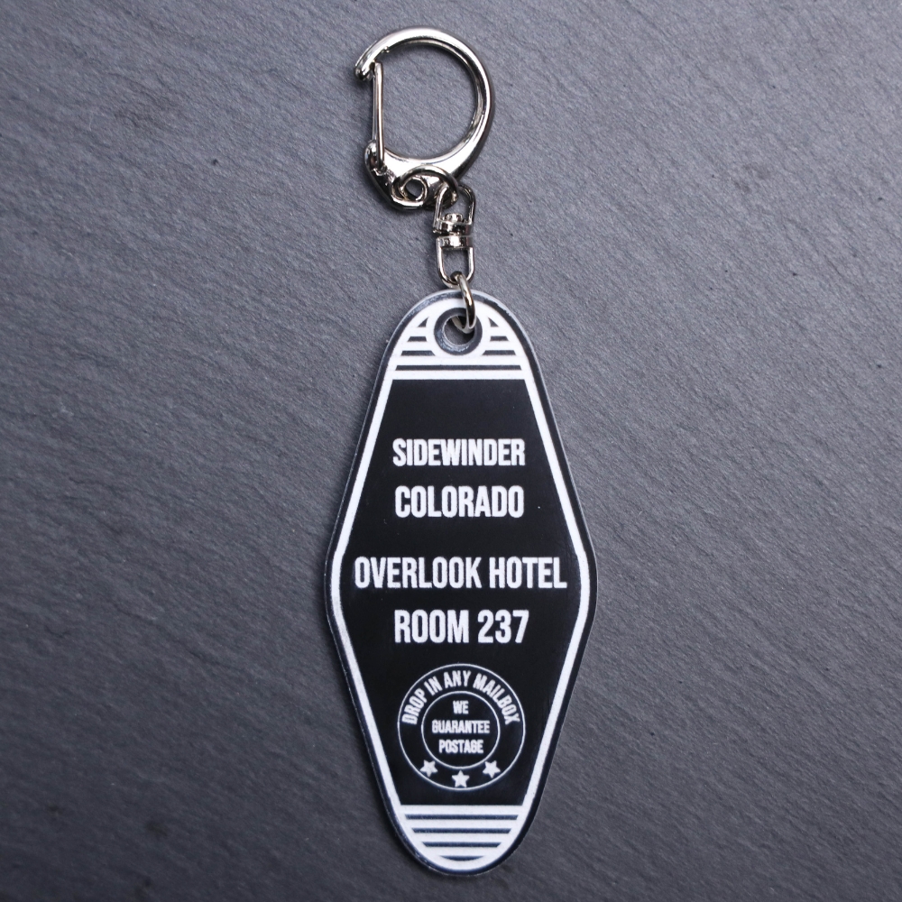 Overlook Hotel Bag Tag. This bag tag is made with engraved acrylic. Comes with lobster clasp topper that easily hooks to a bag, zippers, keychains, and lanyards for fun display and swivels. White backside.