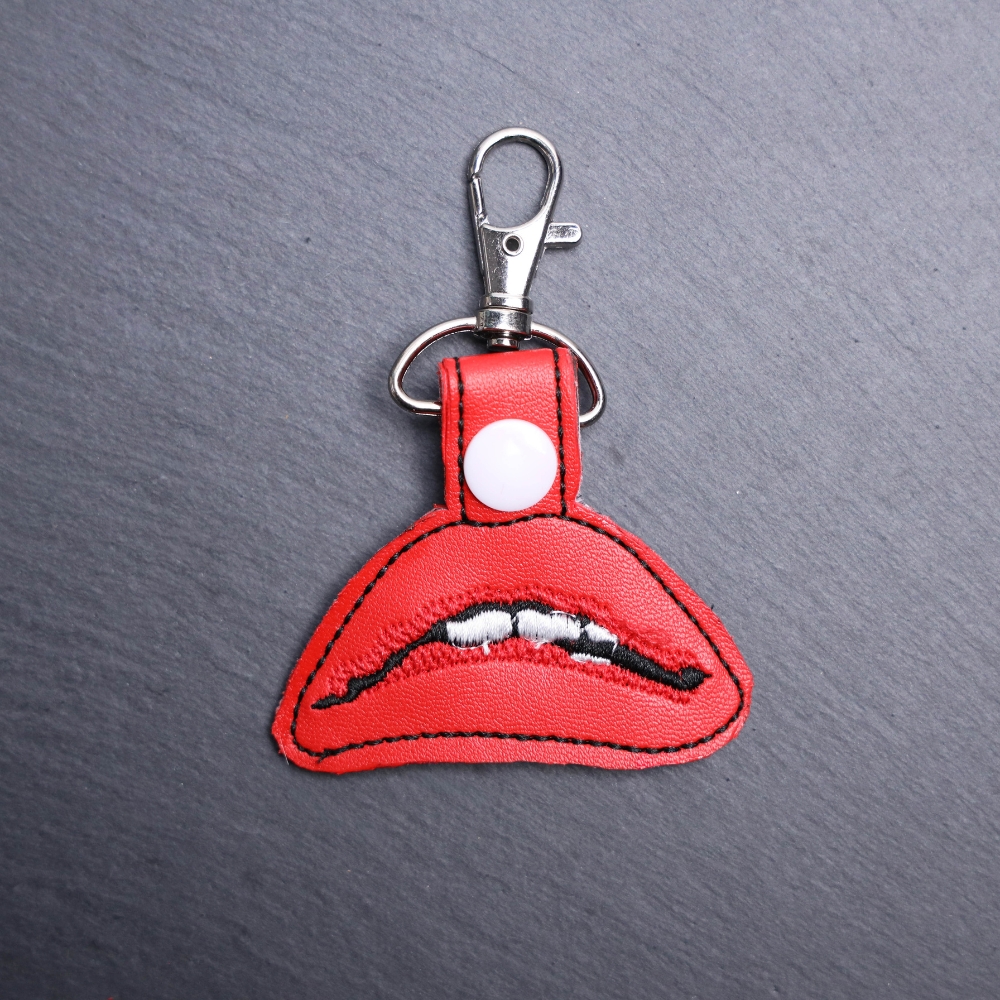 RHPS Lips Snap Bag Tag. This bag tag is made with faux vinyl and embroidered. Comes with lobster clasp topper that easily hooks to a bag, zippers, keychains, and lanyards for fun display and swivels. Backside is the color of the vinyl with a border stitch. Snap color can vary. Edging on this product isn’t perfect as it is hand cut then fabric glue sealed.