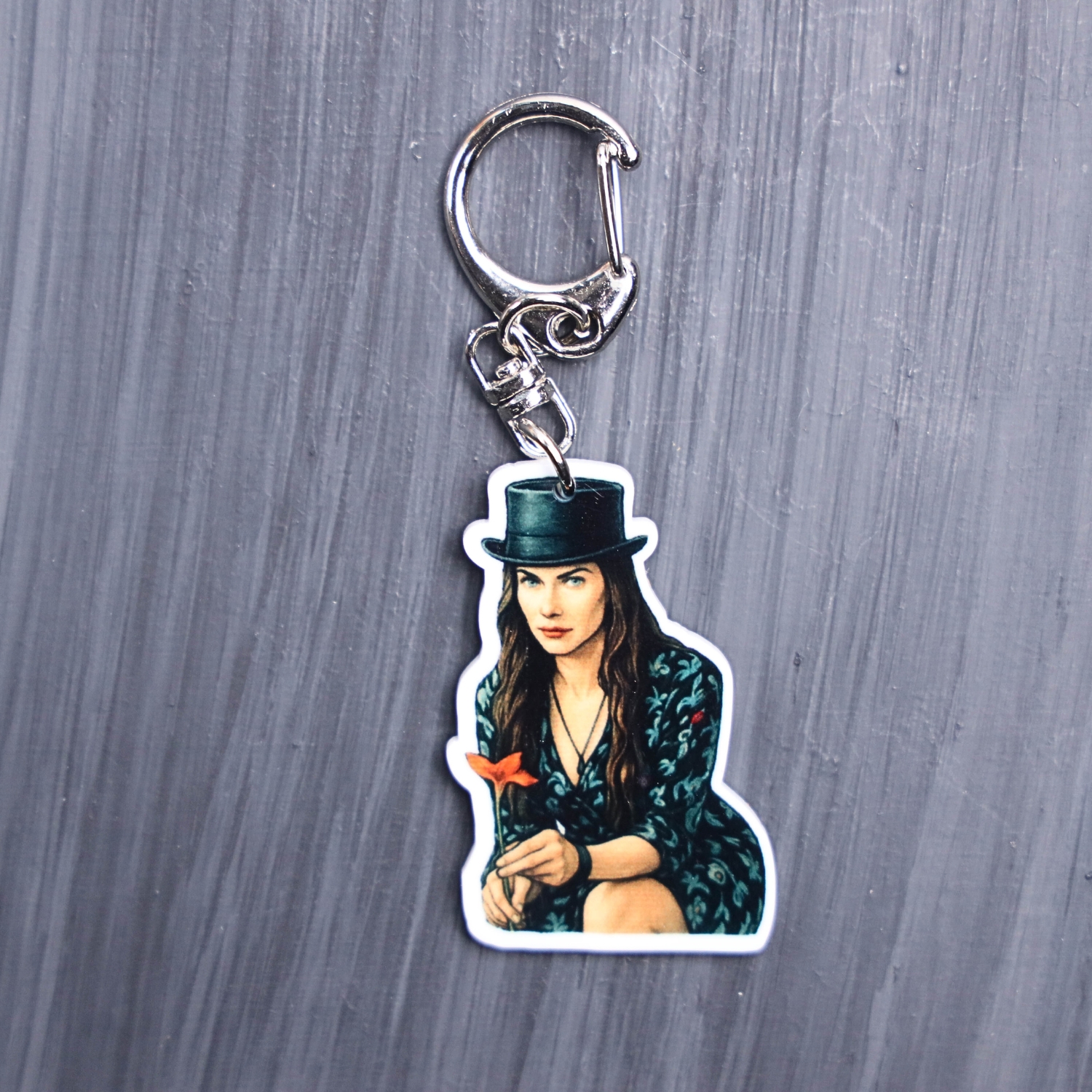 She’s The Hat Bag Tag. This bag tag is made with acrylic and heat pressed. Comes with lobster clasp topper that easily hooks to a bag, zippers, and lanyards for fun display and swivels. White backside.