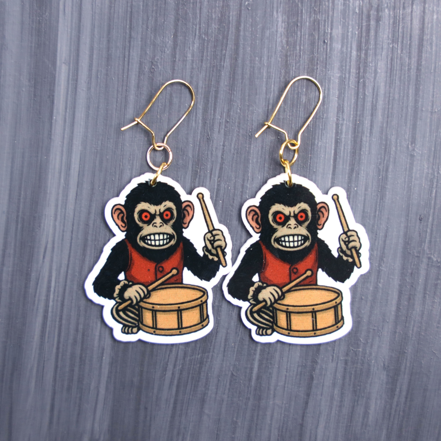 Monkey Earrings. These earrings are made with acrylic and hand heat pressed. Comes with 18k plated gold hooks that is nickel free. Easily put loop through ear and hook back so the earring doesn’t fall out.