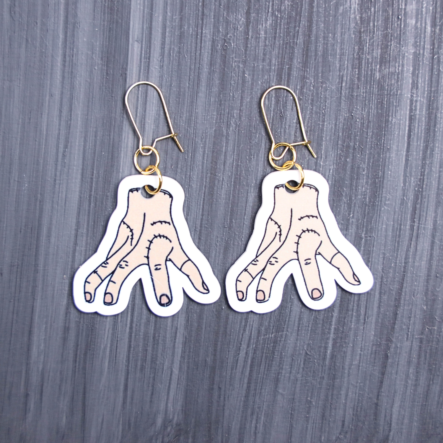 Thing Earrings. These earrings are made with acrylic and hand heat pressed. Comes with 18k plated gold hooks that is nickel free. Easily put loop through ear and hook back so the earring doesn’t fall out.